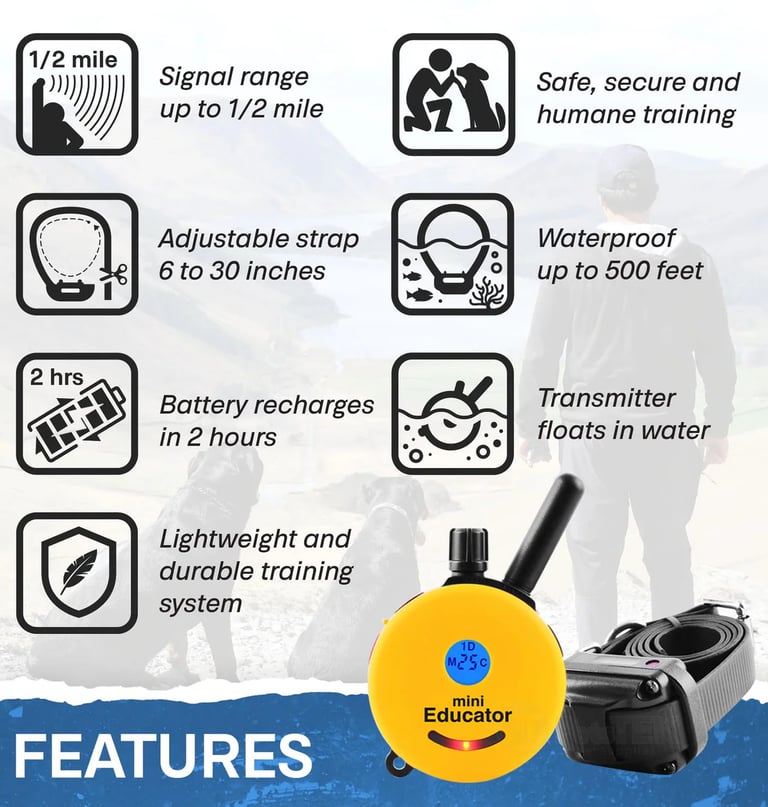 Mini Educator ET-300: Modelo mais utilizado, principalmente para cães de porte médio e grande. Pode ser conectado com até 2 colares no mesmo controle.