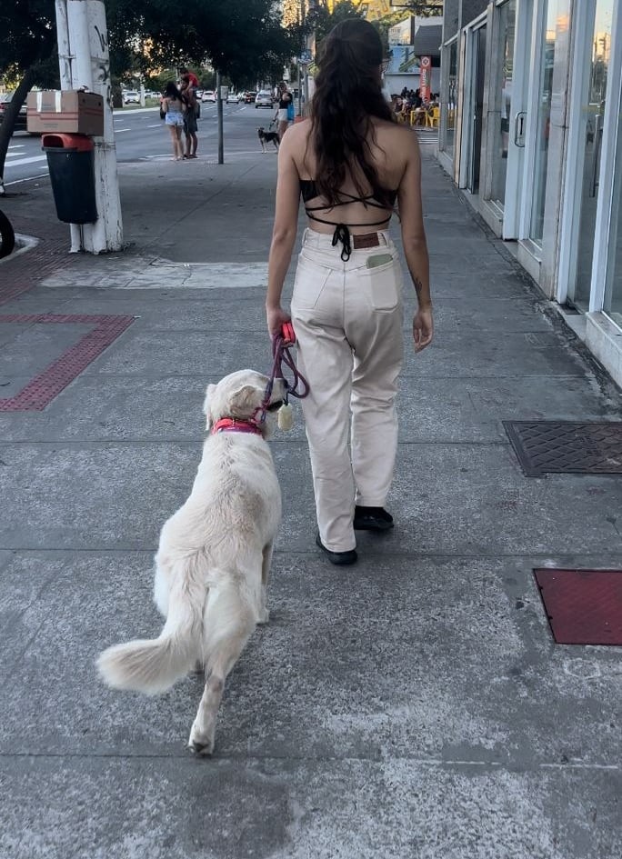 Tenho uma golden de 1 ano e 6 meses, a Polenta. Ela se apresentou reativa desde bebê, quando começamos a passear com ela. Passamos por exatos 3 adestradores antes de conhecermos a Isa. Eu sempre fui muito relutante em usar certas ferramentas de adestramento, mas quando Polenta ainda tinha 8, 9 kg, usava peitoral anti-puxão nela e ela me carregava (além de “torcer” a coluna). Entendi que precisaria mudar isso. Conheci a prong por um outro adestrador da Pops… mas quando vi uma mulher passeando com os dois cães (que ja tinham sido reativos) super tranquila, perguntei como ela conseguia isso. Ela me falou do e-collar e me indicou a Isadora. E sério, a melhor coisa que fizemos foi contratar a Isa e iniciar o treinamento do colar eletrônico com ela. Eu sempre falei com ela que queria uma cachorra educada, que pudesse me acompanhar num churrasquinho, por exemplo, e hoje eu tenho. Polenta é um exemplo de educação. Hoje em dia eu mantenho o adestramento com a Isa para ter uma cachorra nula para outros cães, e fazer alguns refinamentos.